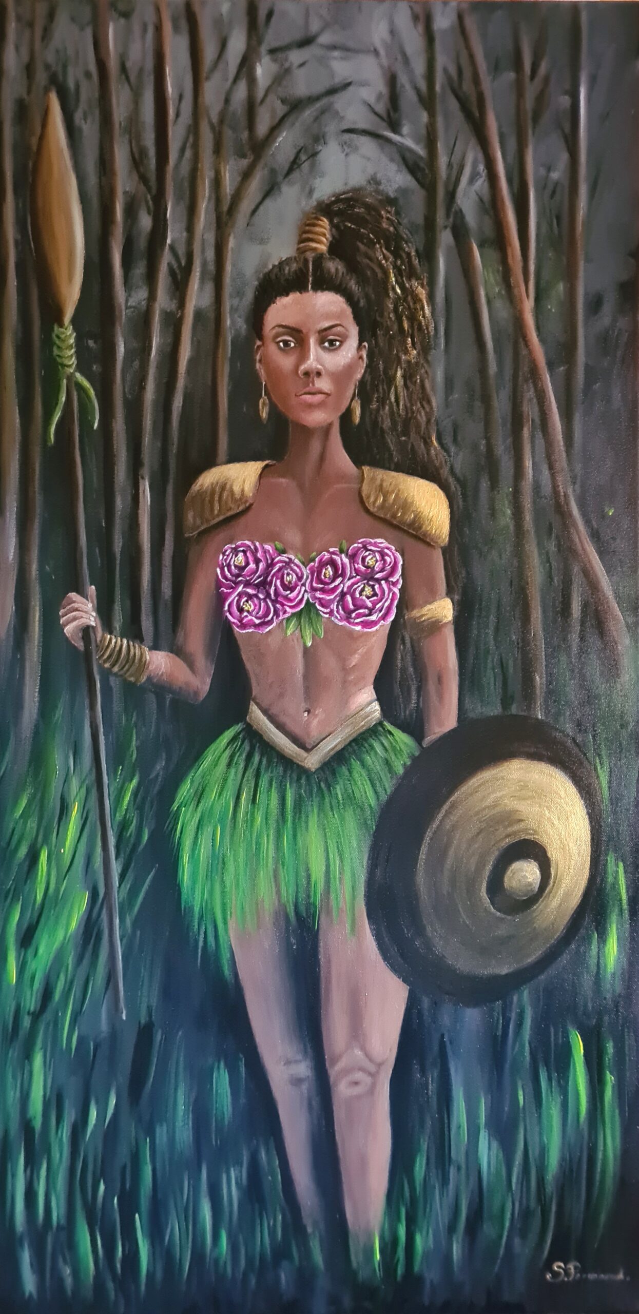 Cette toile unique représente une Amazone combattante, symbole de force et de résilience.